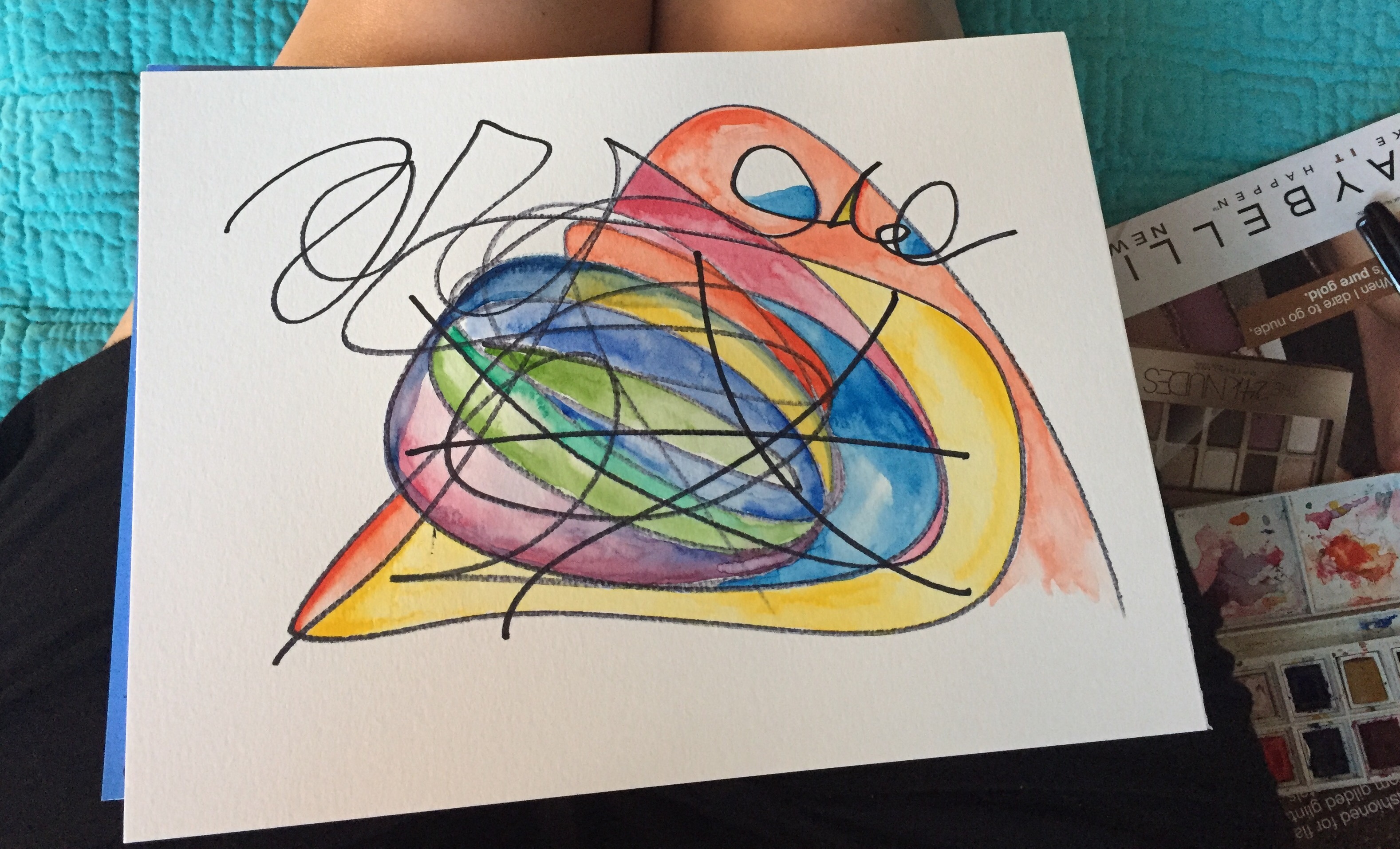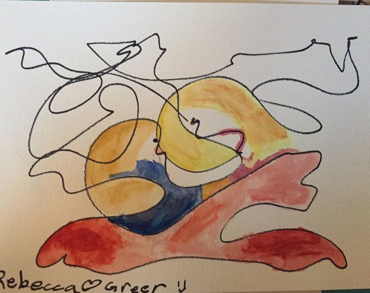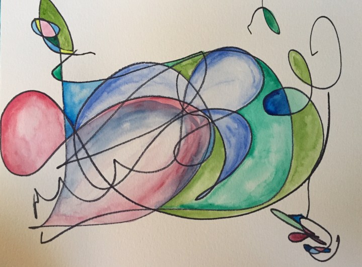 I went to school to be an artist. I used this training to calm my mind today. I had my daughter who is 11 years old scribble on some watercolor paper. Then I painted what I saw in the scribbles. My 11 year old did the bird at the top. My 9 year old scribbled the next one.  I scribbled on the 3rd picture. My 9 year old painted the screaming people. I think art helps me to relax. It helps me think of something else. It calms my soul. It does the same thing as writing.